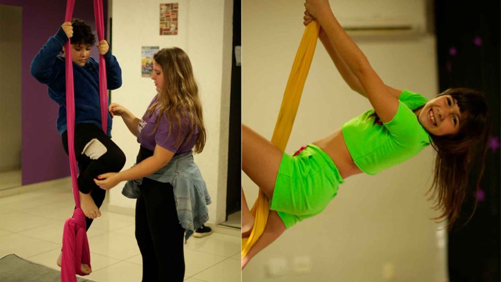 As aulas de tecido acrobático foram criadas para que as crianças possam desenvolver equilíbrio, força e autoconfiança de um jeito leve e divertido.